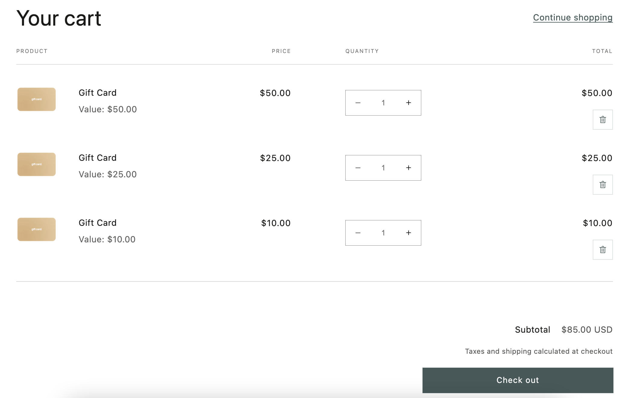 You'll notice that a separate item will be added to the cart for each gift card value included in the file: