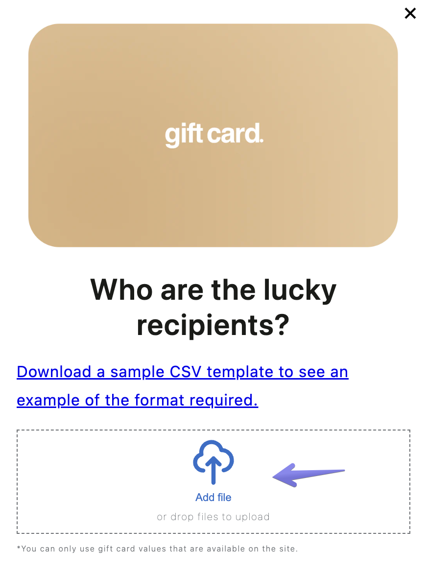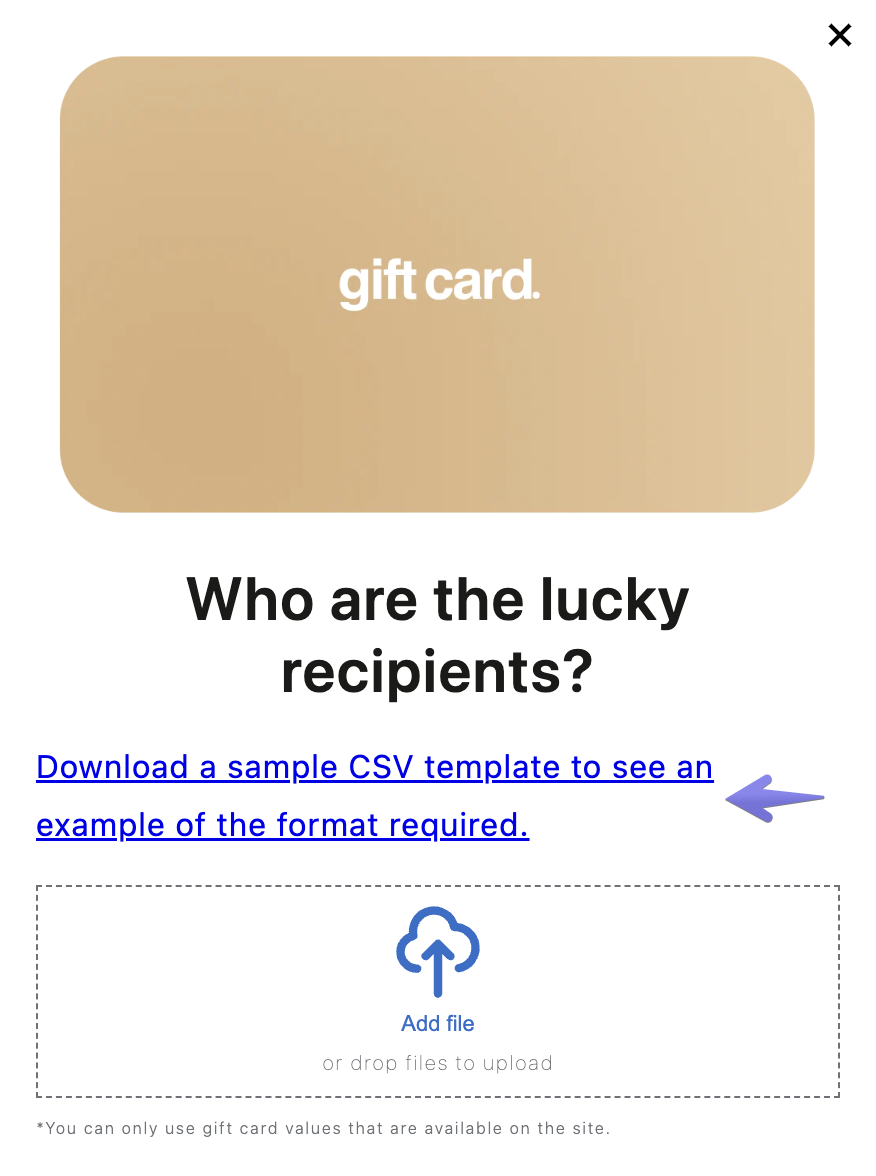 If your file contains, for example, two $10 gift cards, both would be under the same item in the cart, and its quantity will be set as "2". Rest assured that each gift card will be correctly sent to each recipient, as we will be handling this on the backend.