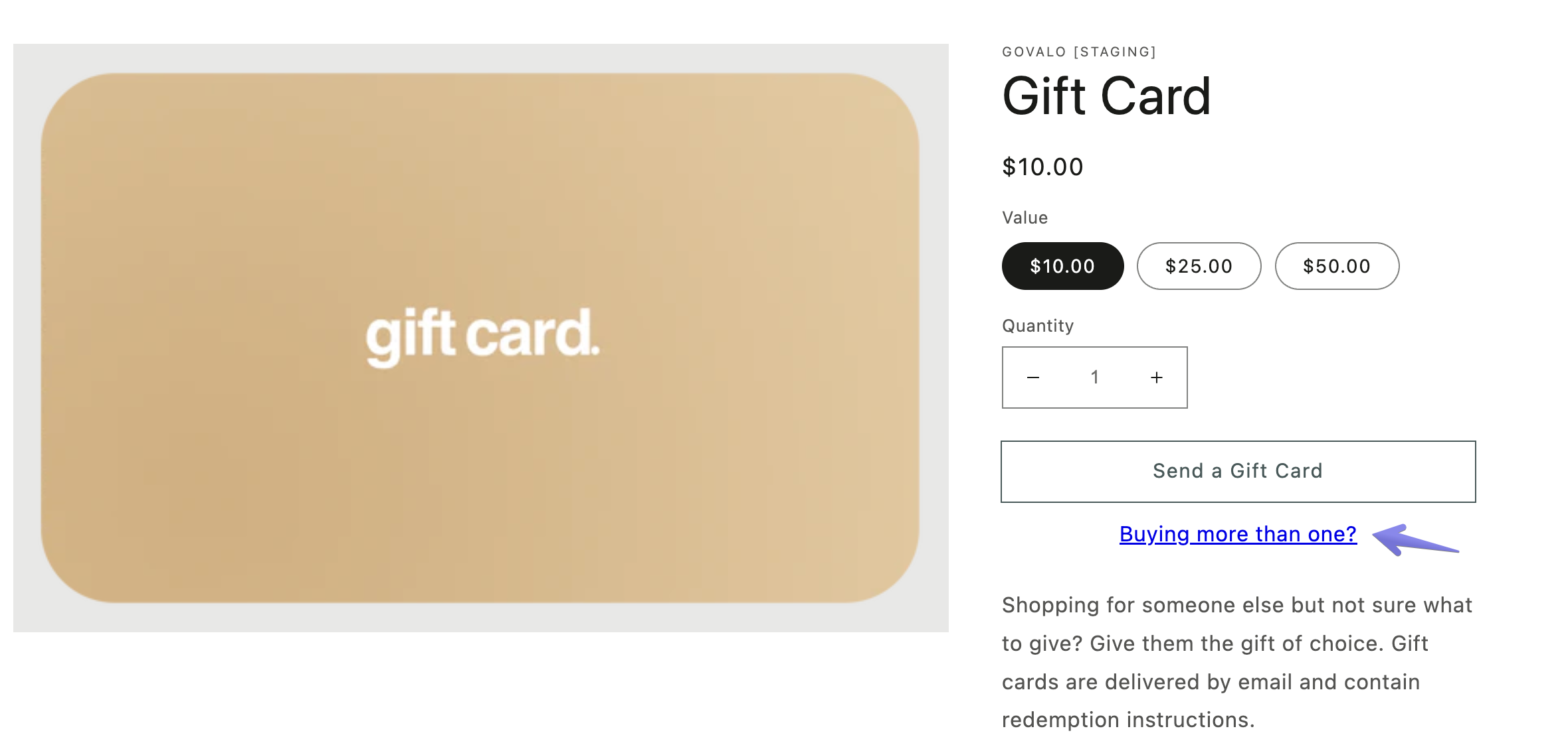 Corporate Gifting, also referred to as "Bulk Gifting", is the ability to issue multiple gift cards, sent to different recipients, all at once. While that could already be done by merchants through the Govalo app (see How to issue multiple Gift Cards in bulk via admin), we have now added the ability for customers to do it from the Gift Card product page in your store.