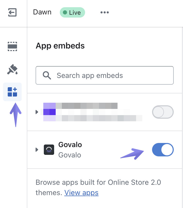 Navigate into App embeds, toggle Govalo on, then Save your settings: