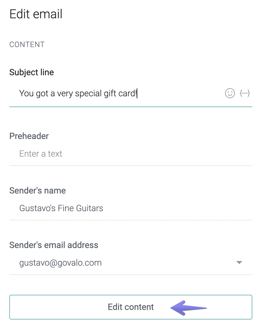 Fill out the required fields for the email, then click Edit content (make sure to save the changes done so far when prompted):