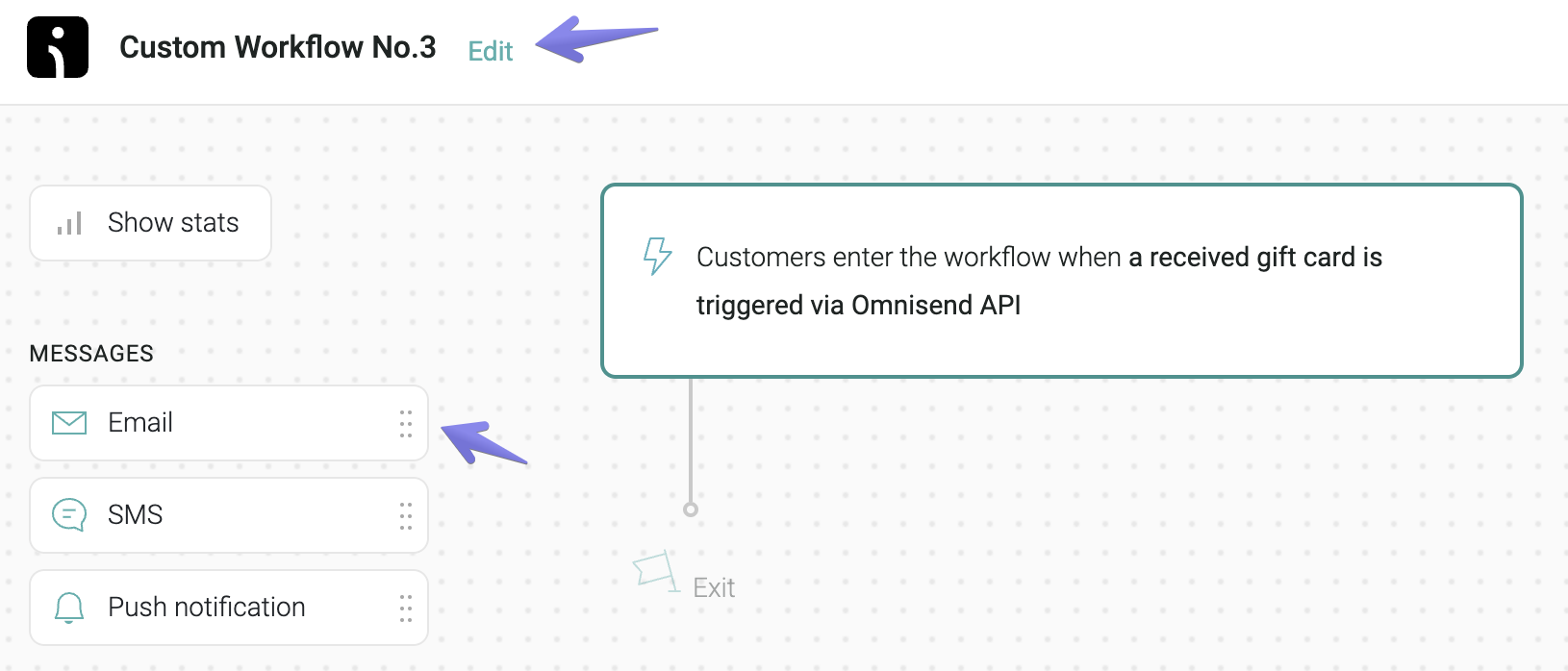 Drag the component Email and drop it right under the first block in your workflow. At this point you can also Edit your workflow's title (you may name it "Received gift card", for example):
