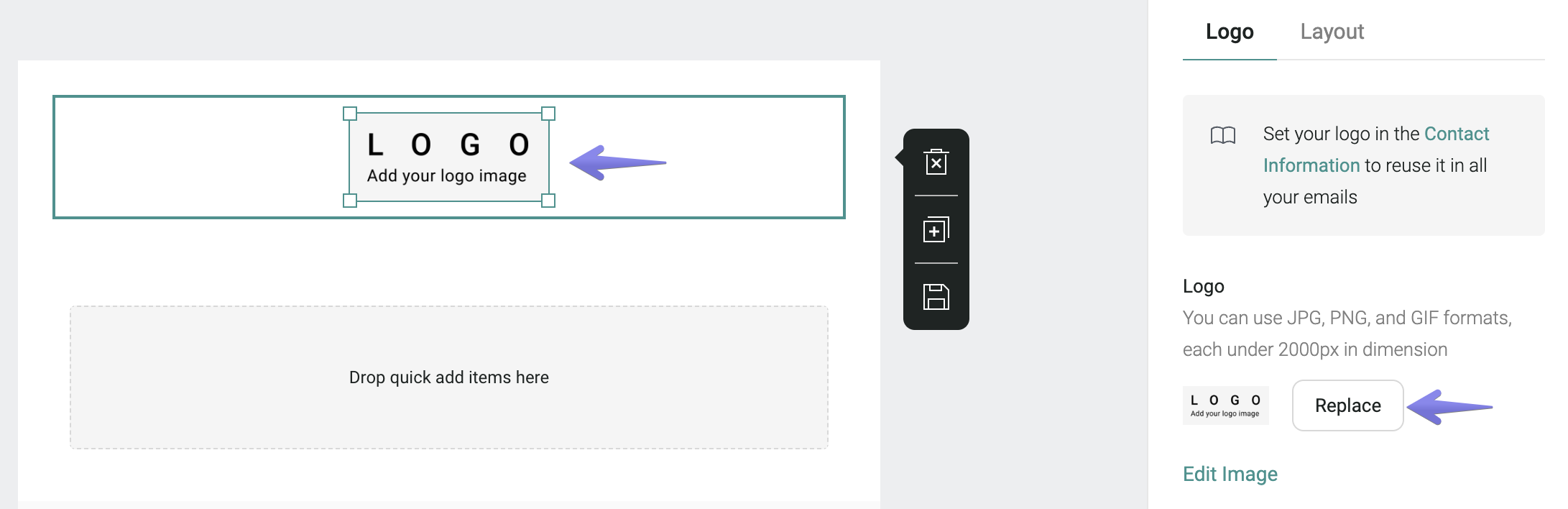 In the email editor, you may add your store's logo by clicking over the Logo, then Replace, and following the instructions on Omnisend to upload your logo: