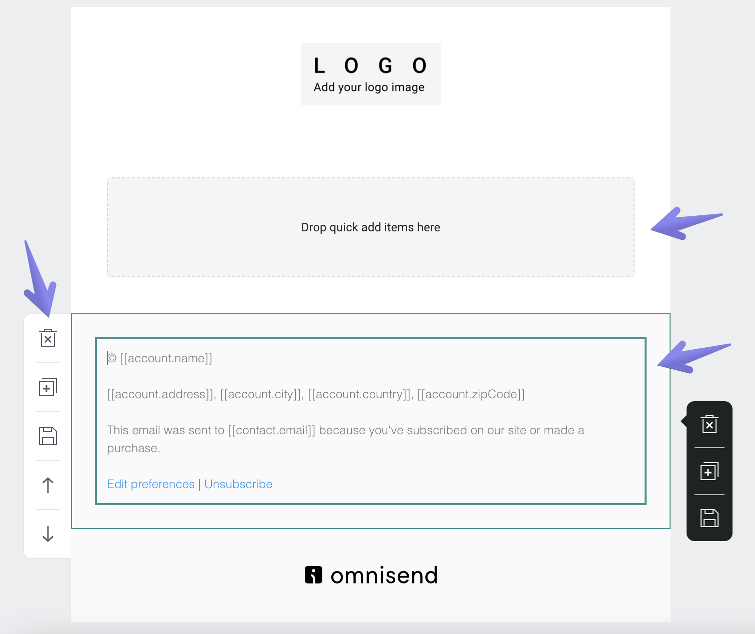 Through their email editor, Omnisend offers a lot of flexibility when setting up your email template, allowing you to add multiple elements of various types. For the purpose of this guide, our steps will go over setting up a simple template, using a HTML block to help rendering the variables sent to Omnisend by Govalo. You may add extra elements and modify the template as necessary.