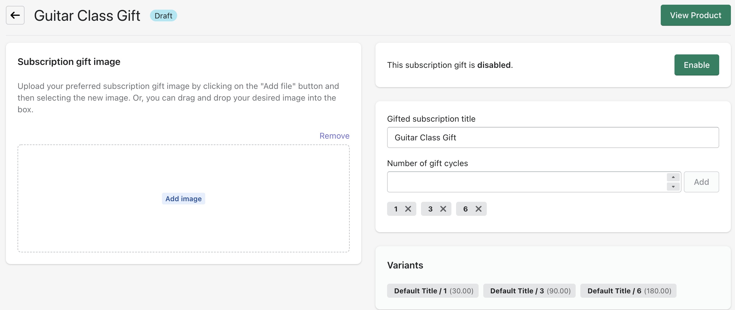 Customize your subscription gift product. You have the ability to edit the product name, image, and number of times the subscription will be sent (cycles). Once you're ready for the subscription gift product to go live, click Enable.