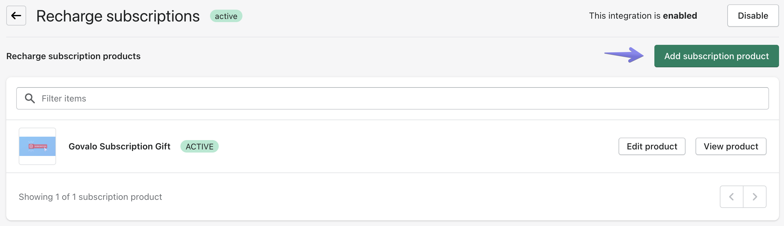 Back to Govalo, in the Recharge integration dedicated page, click Add subscription product: