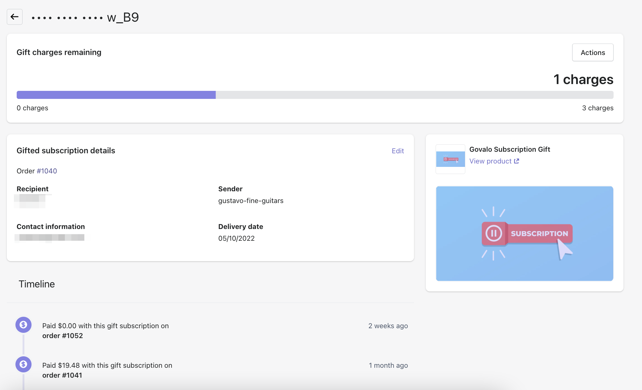 As subscription gifts are issued, you'll be able to see them listed at the bottom of the Recharge dashboard within the Govalo app. You can also navigate into each subscription gift issued in order to view their details and resend the email if necessary.
