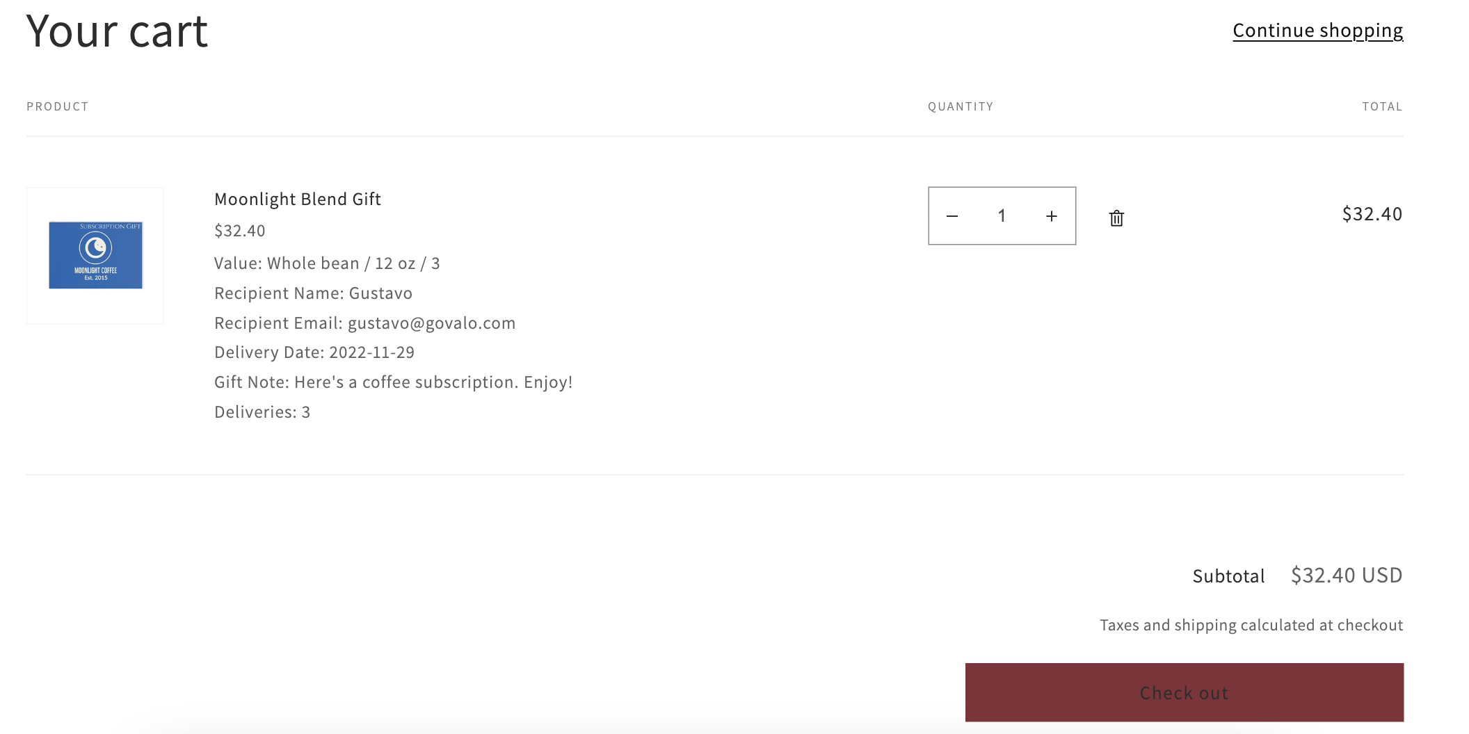 Note: recipients must still enter their payment details on checkout when redeeming a subscription gift. This is a Shopify requirement so they can be enrolled in a subscription.