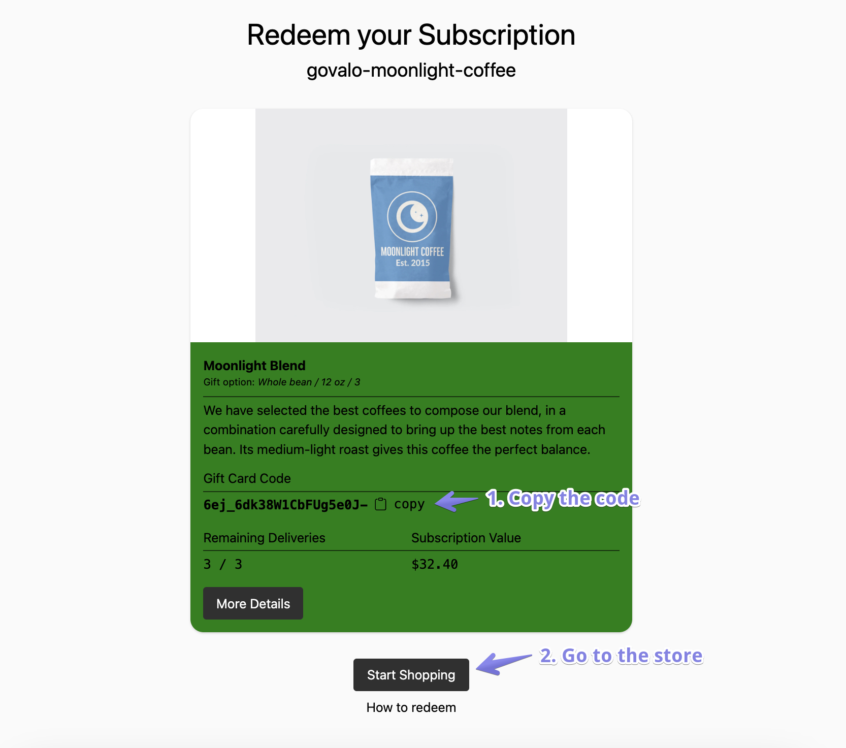 The recipient will first copy their gift code, then click Start Shopping, which will take them to your subscription page: