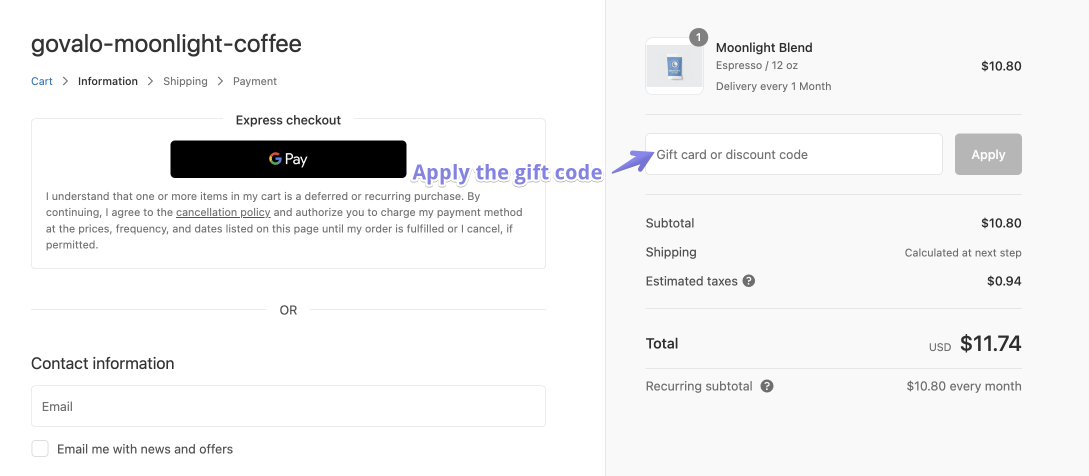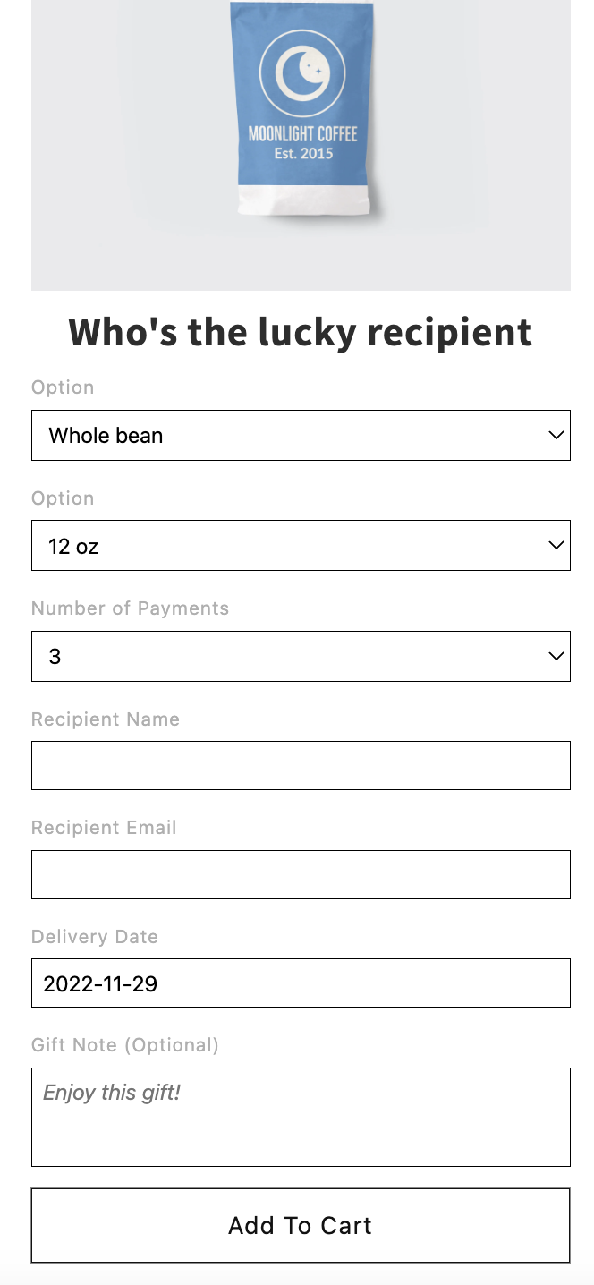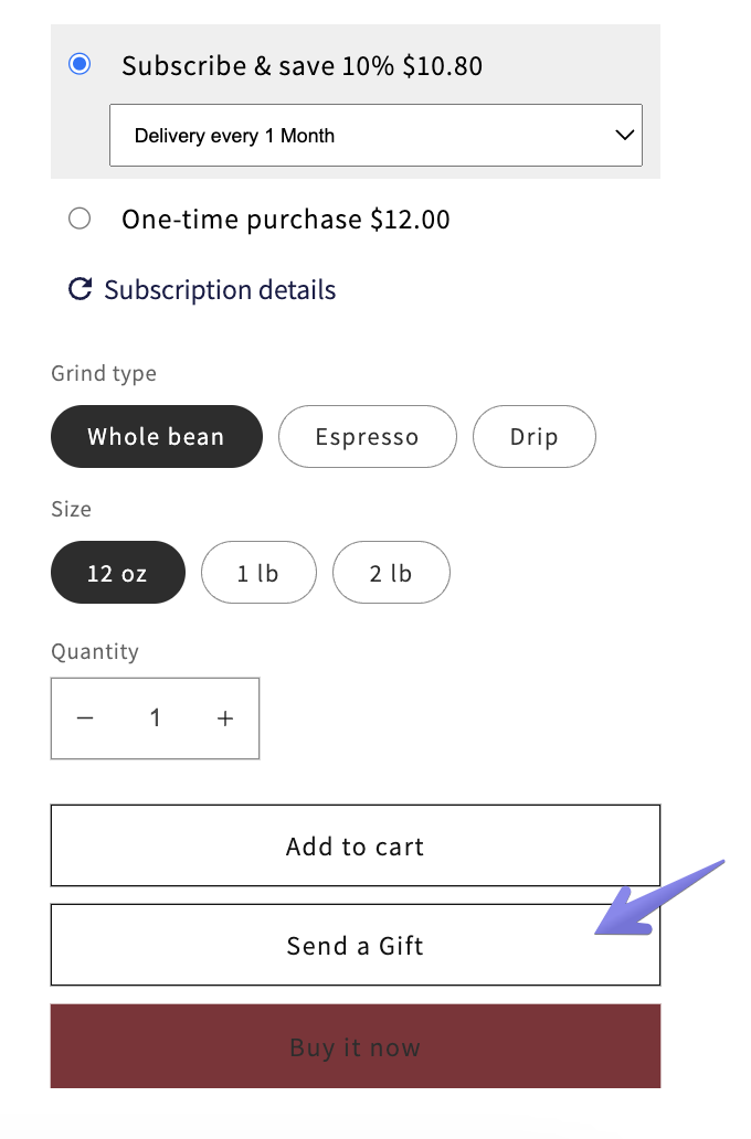 - If your subscription has different variants, select what they wish to gift, e.g. a subscription for a "12 oz coffee bag, whole bean"