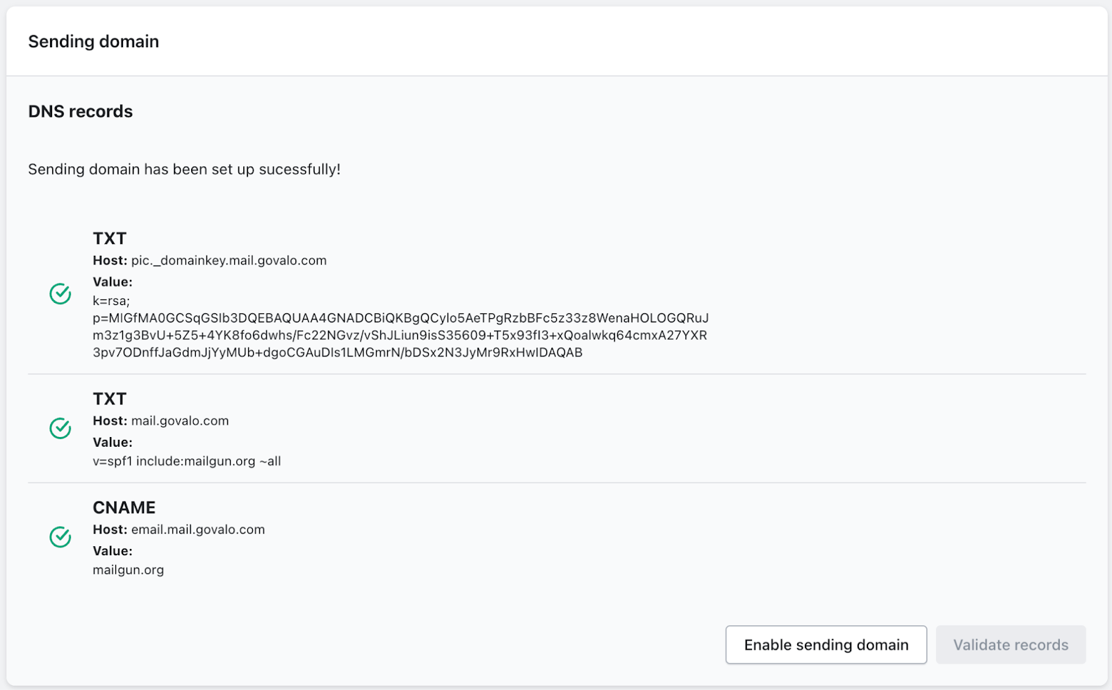 Once the DNS records have been validated you can click “Enable sending domain” to start using it!