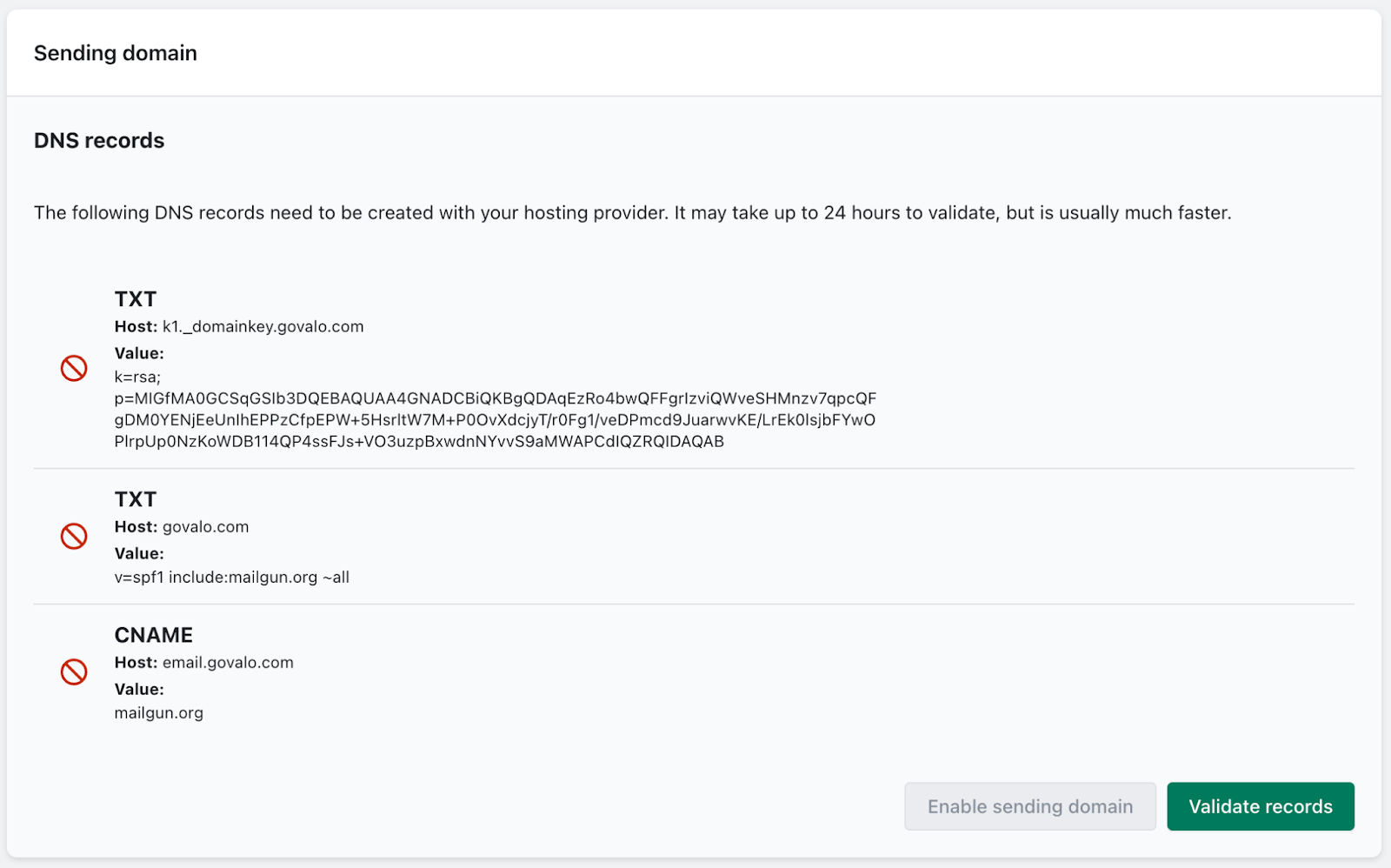 In order to send email using your domain you must create the given DNS records. This process varies from provider to provider, but the type (“TXT” or “CNAME”), “Host”, and “Value” are what you need.