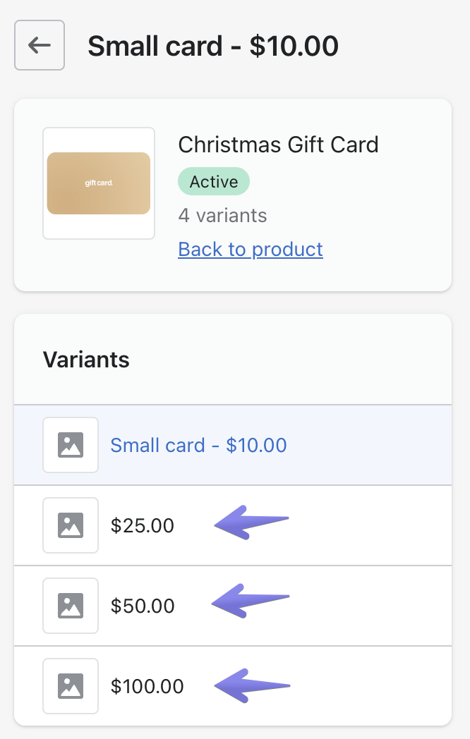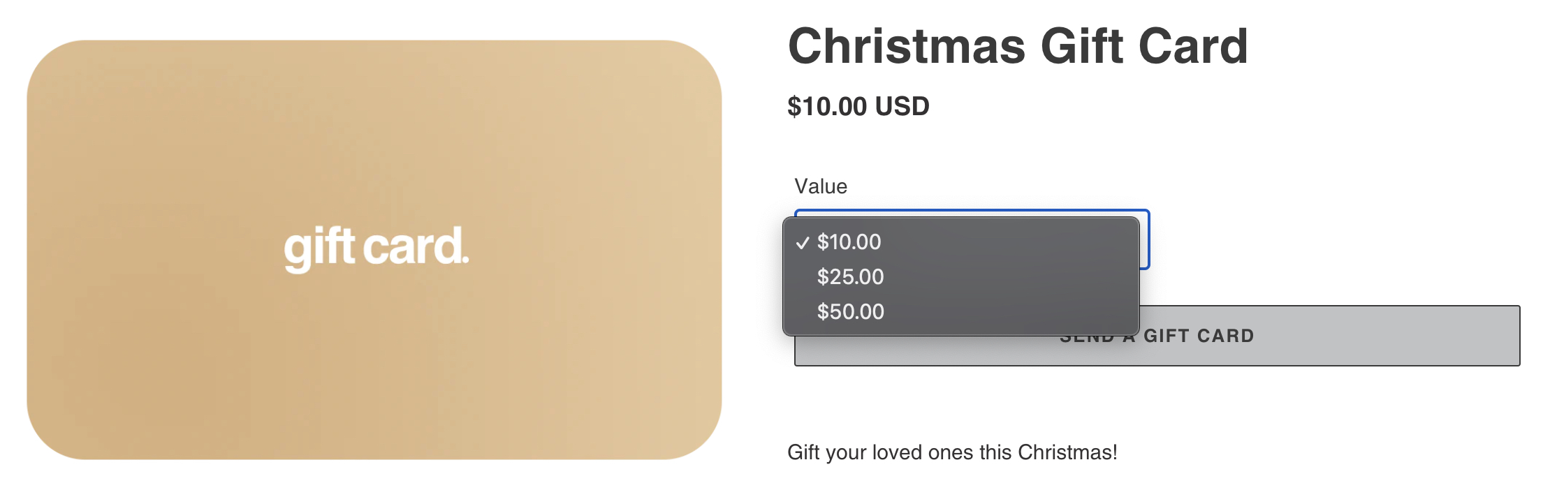 With that information, we create a corresponding product on Shopify, with each value being set as a variant of that product. Here's what the gift card product and its variants look like in the front end: