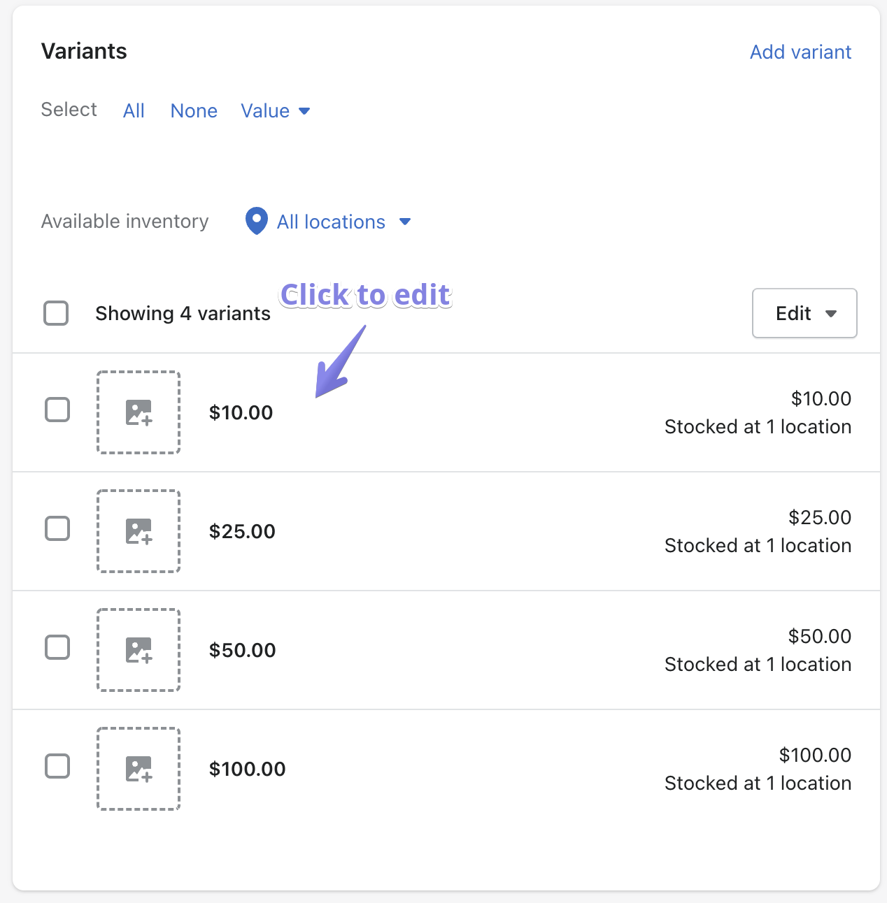 Scrolls down until you see the Variants, then click on the first variant to open the variants editor: