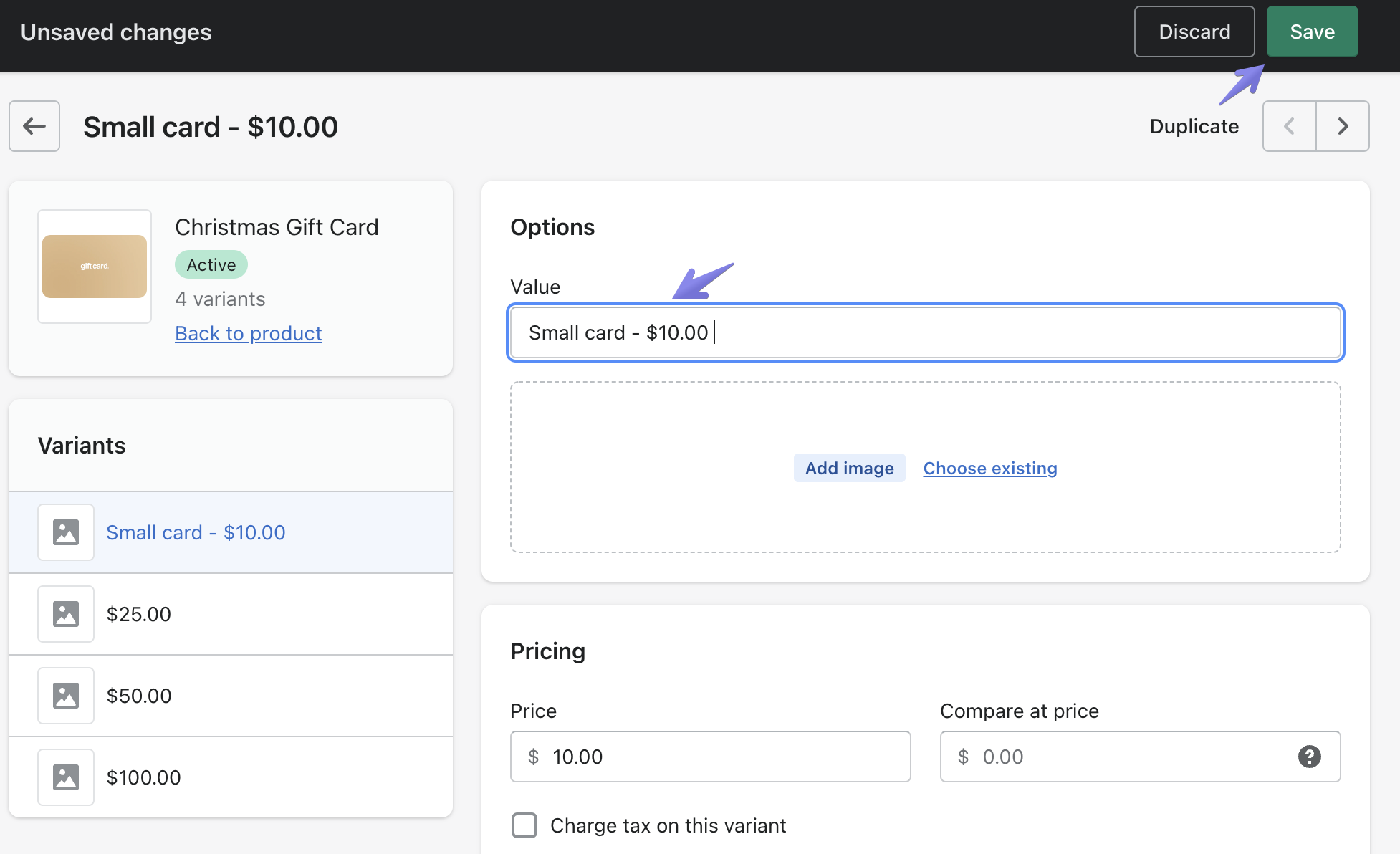 In the editor's left panel, you can navigate to the other variants in your gift card product and repeat the same steps to adjust their title: