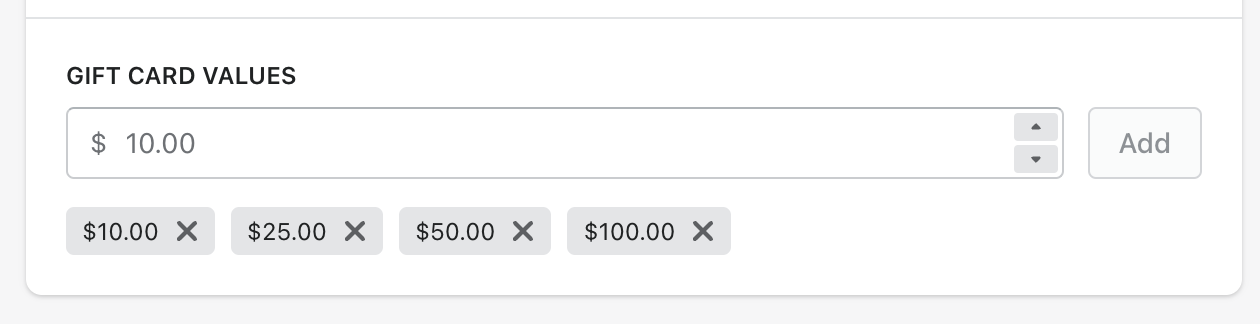When creating your gift card products through Govalo, you will define what values, or denominations, will be offered as options for customers buying a gift card.