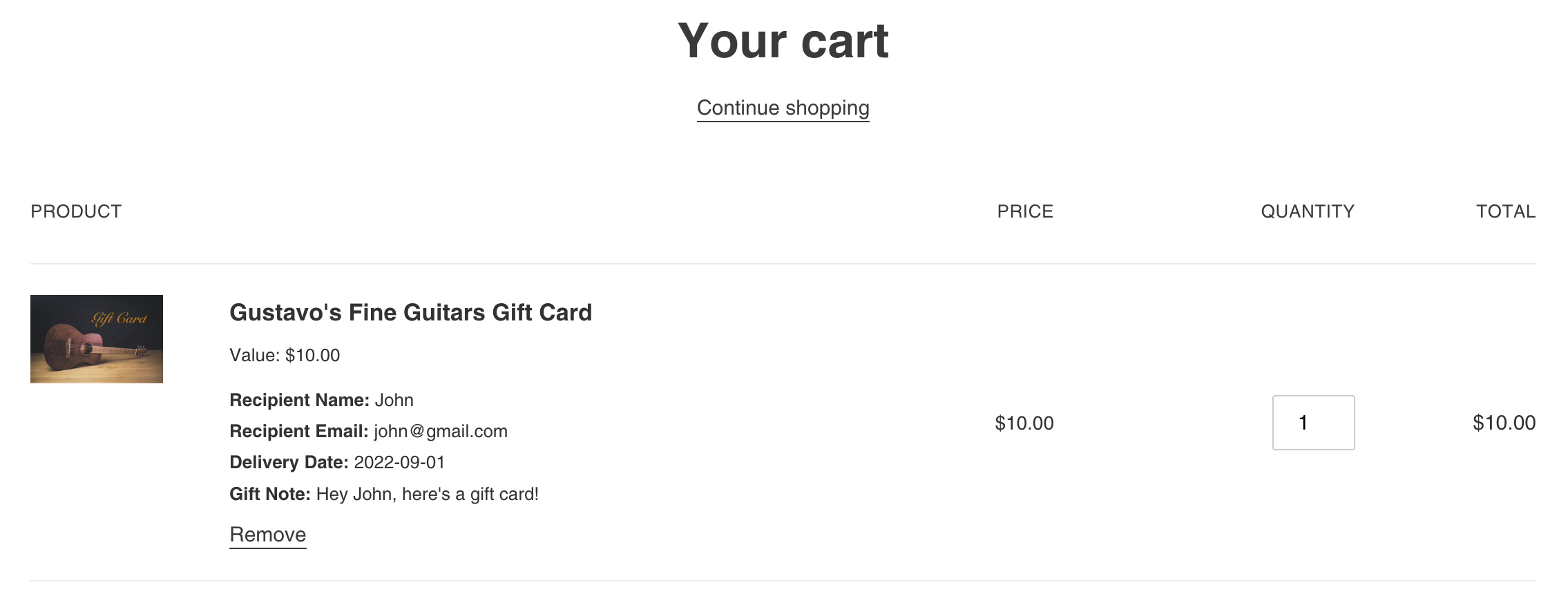 Govalo's gift card has some line item properties which are added with it to the cart, and displayed as follows: