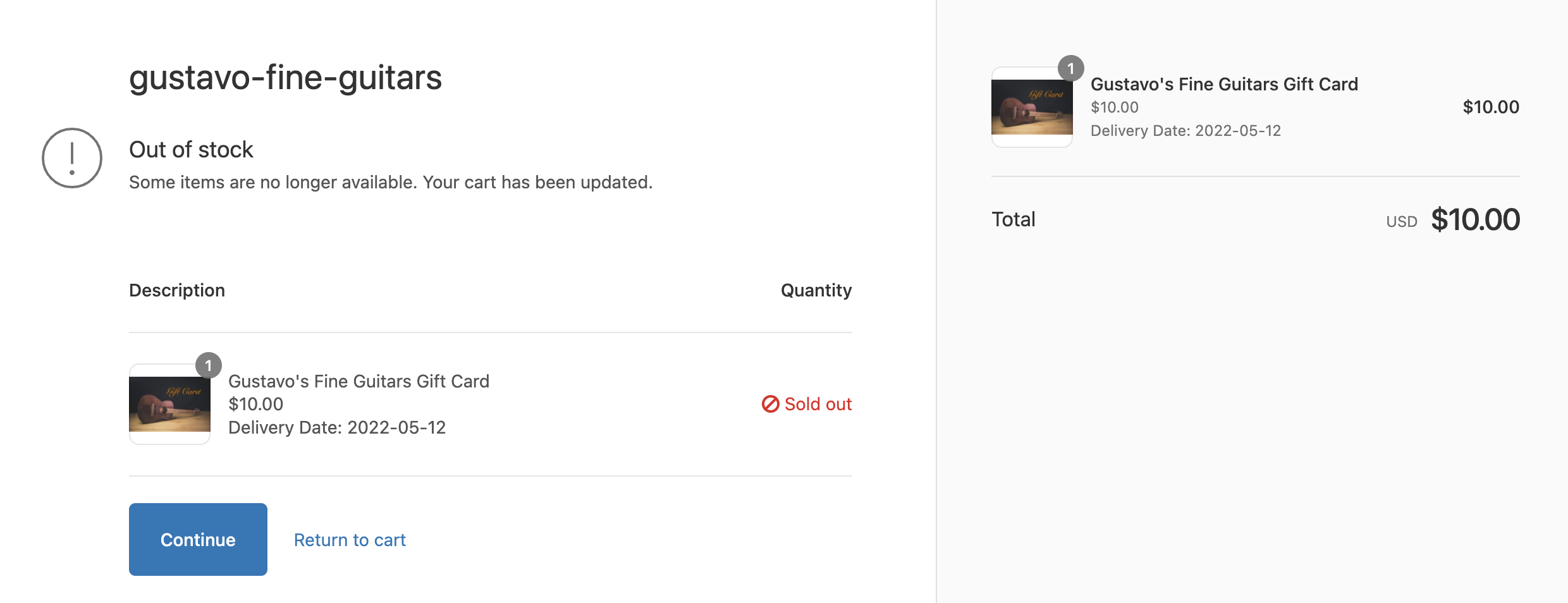 Govalo has been integrated into your store, and the gift card product is working - you are able to fill in the recipient details, add the gift card to the cart, but when you get to checkout, you see a Sold out message: