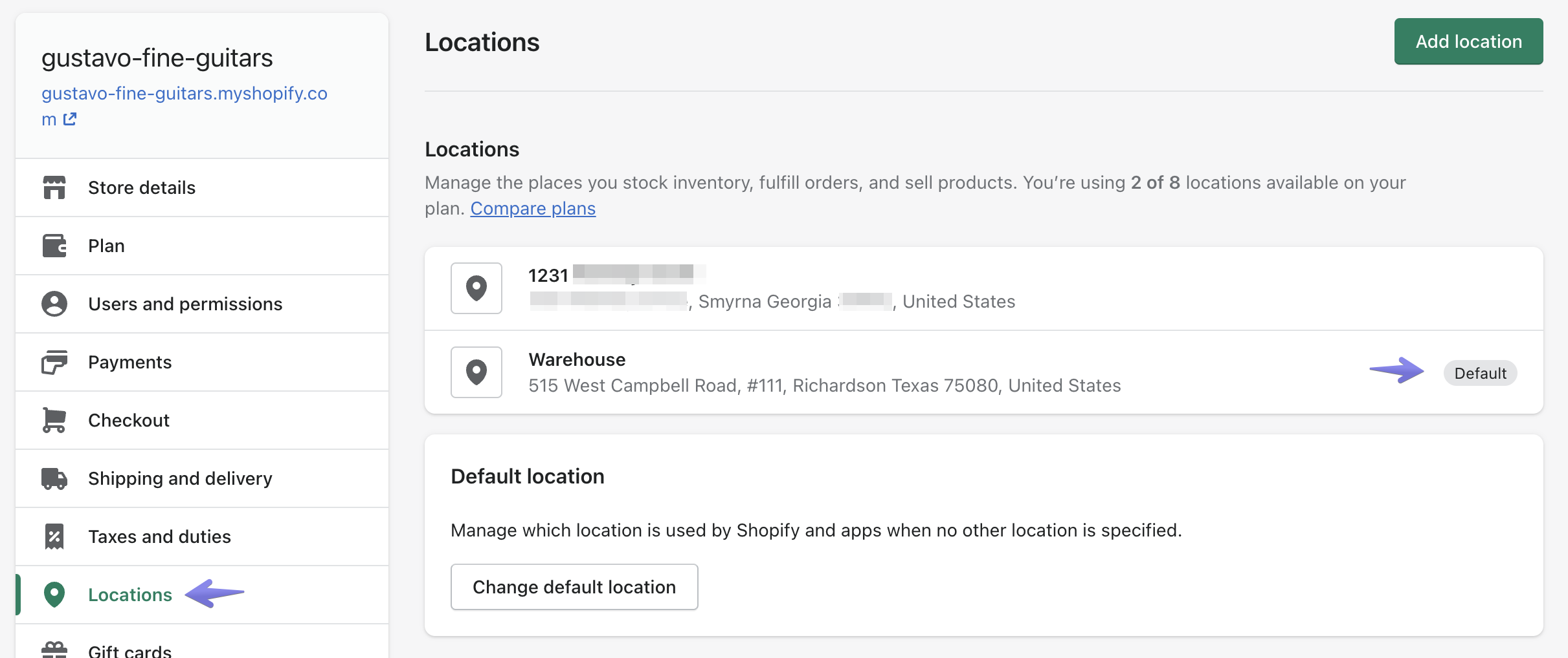 In Shopify, go to Settings > Locations, and check which one is your default location: