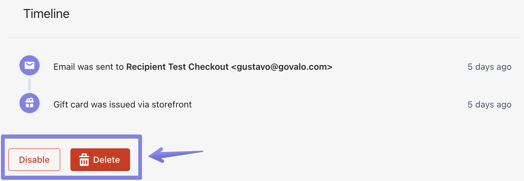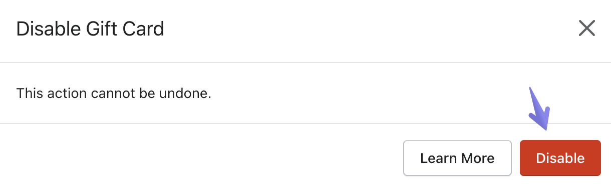Scroll down and locate the gift card you wish to disable in the Active gift cards list.