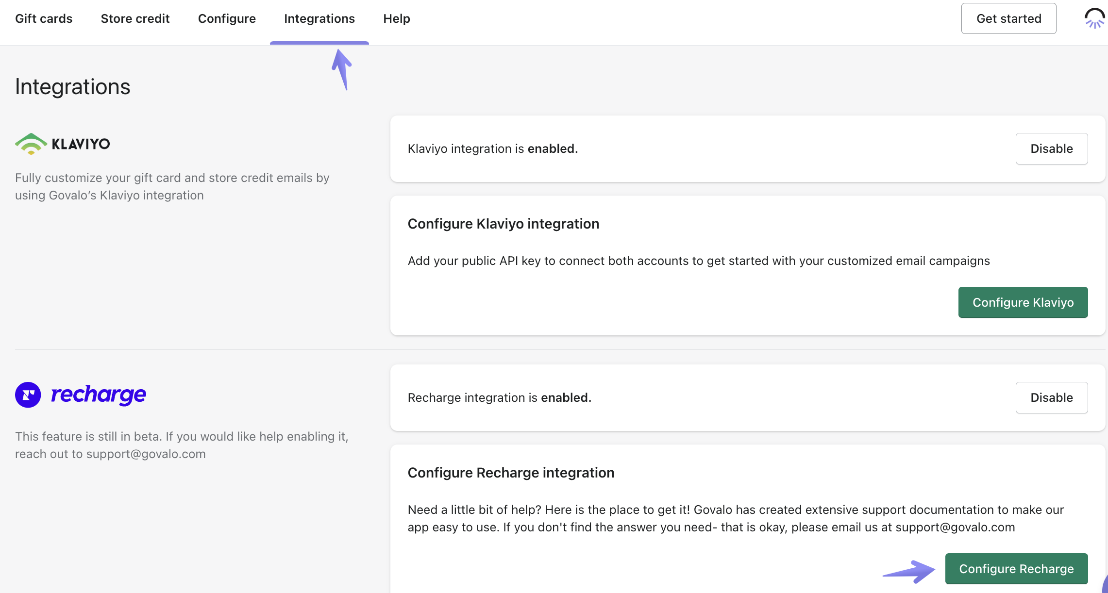 In the Govalo app, go to Integrations, then click Configure next to the subscription app integration you have (Recharge or Bold Subscriptions):